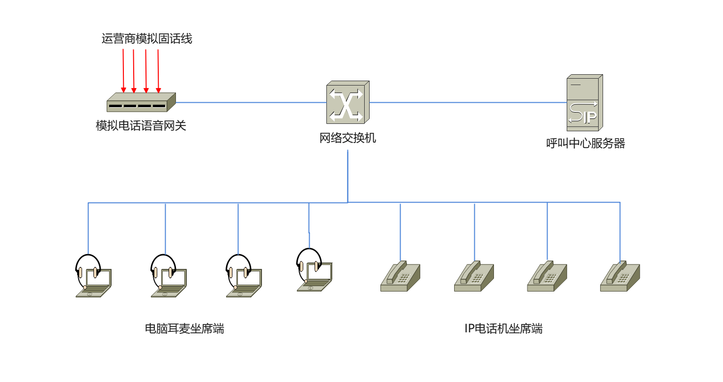 支持接入普通电话线,实现呼叫中心能力,支持配置成类似于10086一样的语音导航菜单。如果希望对外显示统一号码,可以办理400或者一号通(模拟中继)业务。